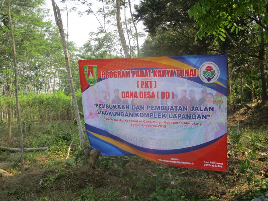 Hari Minggu tanggal 15 September 2019 telah dilaksanakan pembukaan dan pembuatan jalan komplek lapangan Desa Podosoko dengan metode padat karya tahun anggaran tahun 2019. Tujuan penyelenggaraan padat karya ini adalah untuk memberikan tambahan kepada rumah tangga miskin dan memupuk gotong royong antar masyarakat di Desa Podosoko.